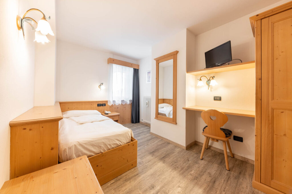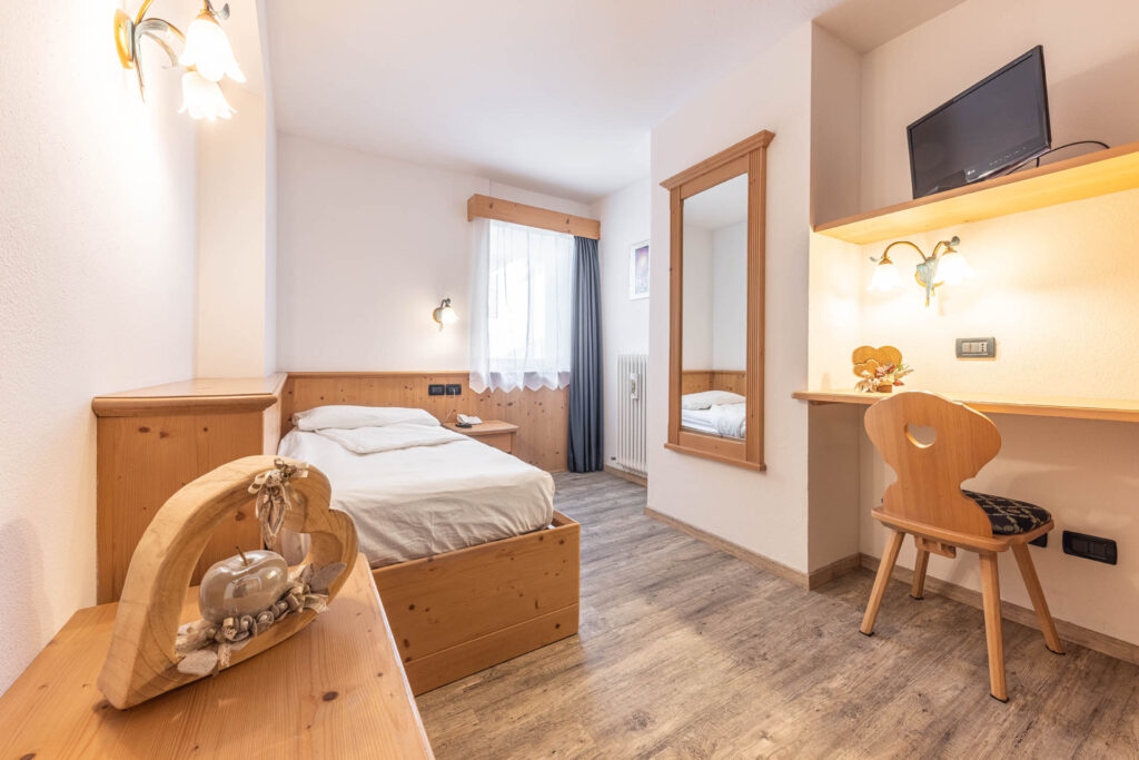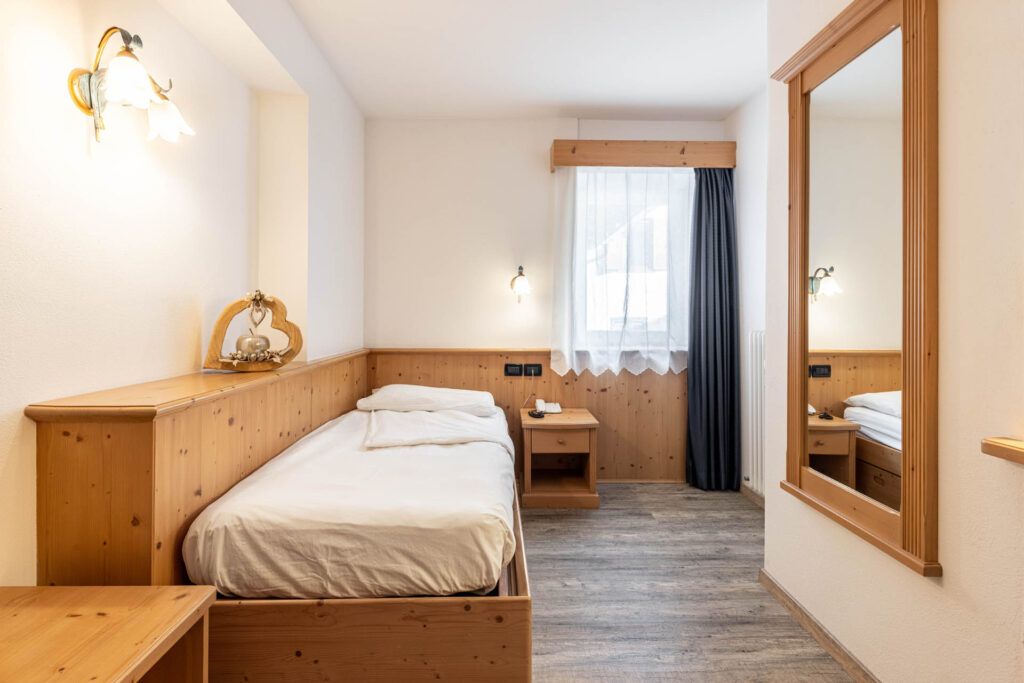 La camera singola è arredata in stile alpino, con legno a vista. Ha un letto singolo o un letto alla francese, ampie finestre e un bagno privato accessibile anche alle persone disabili.